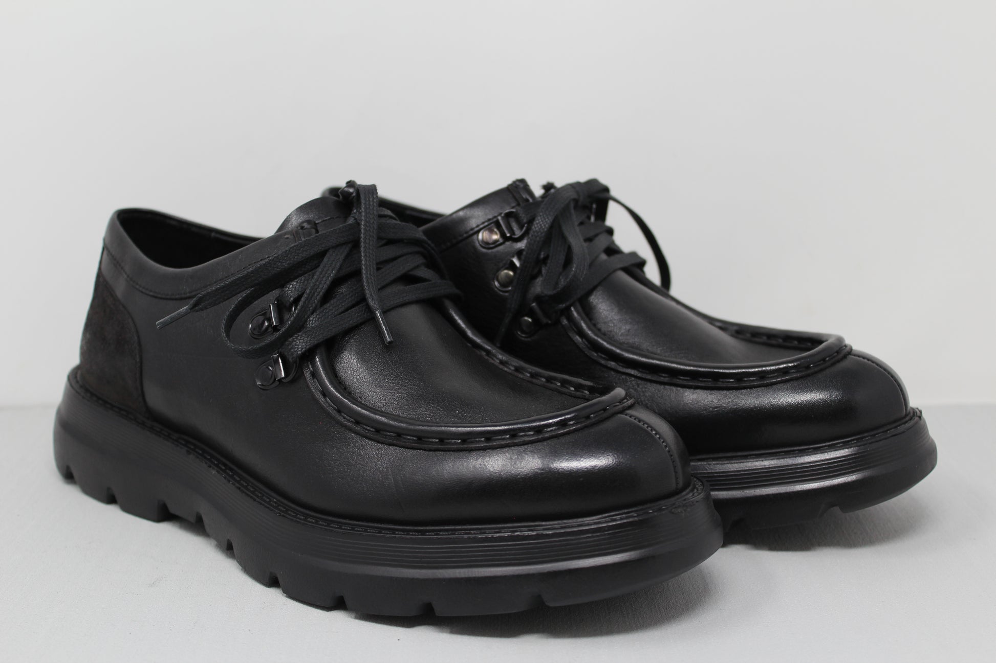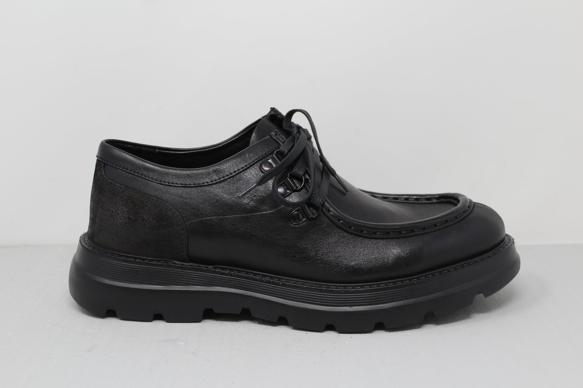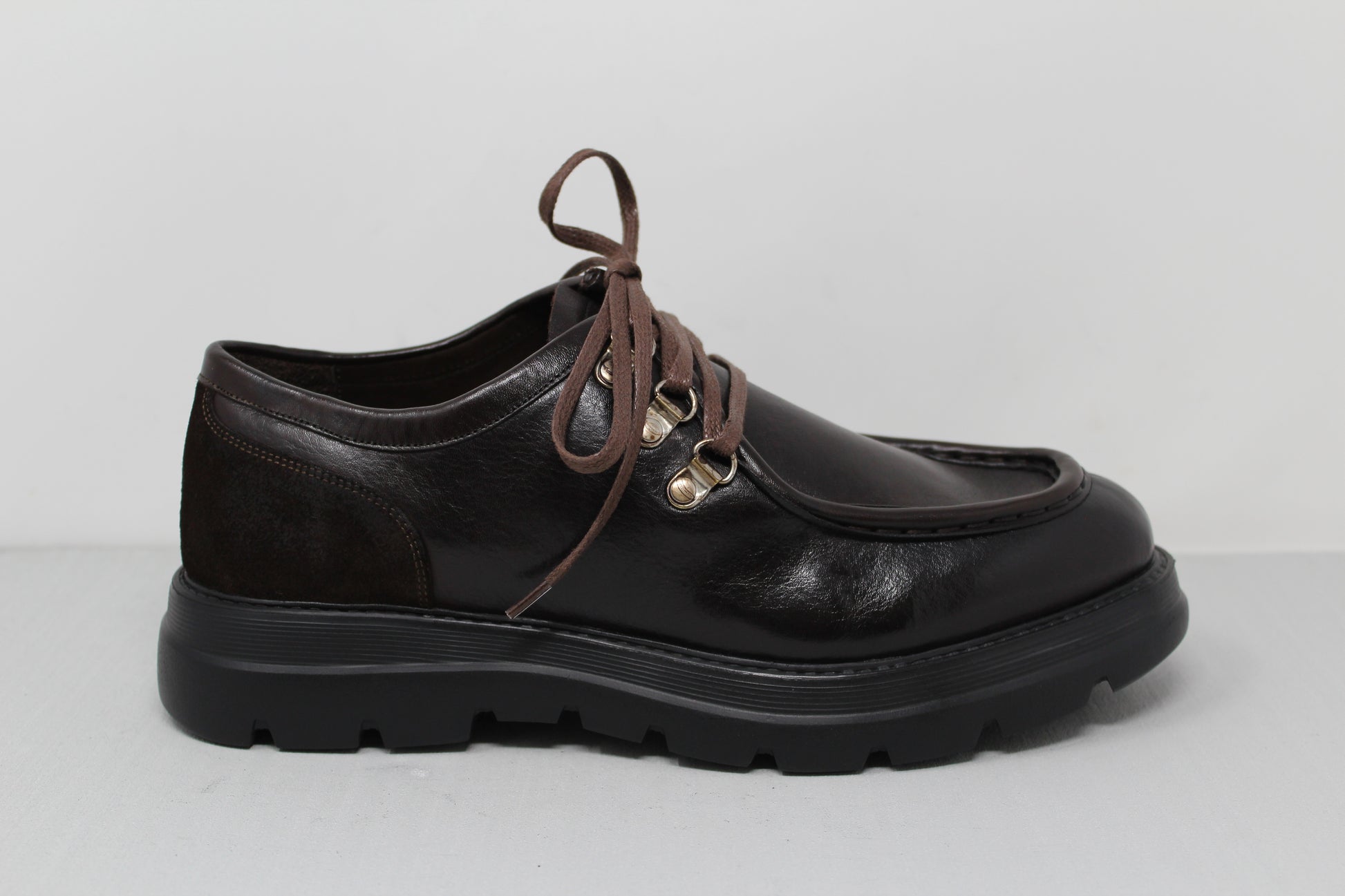 Low shoe with 3-hook lacing and hand-stitched toe, made of calfskin with suede insert.