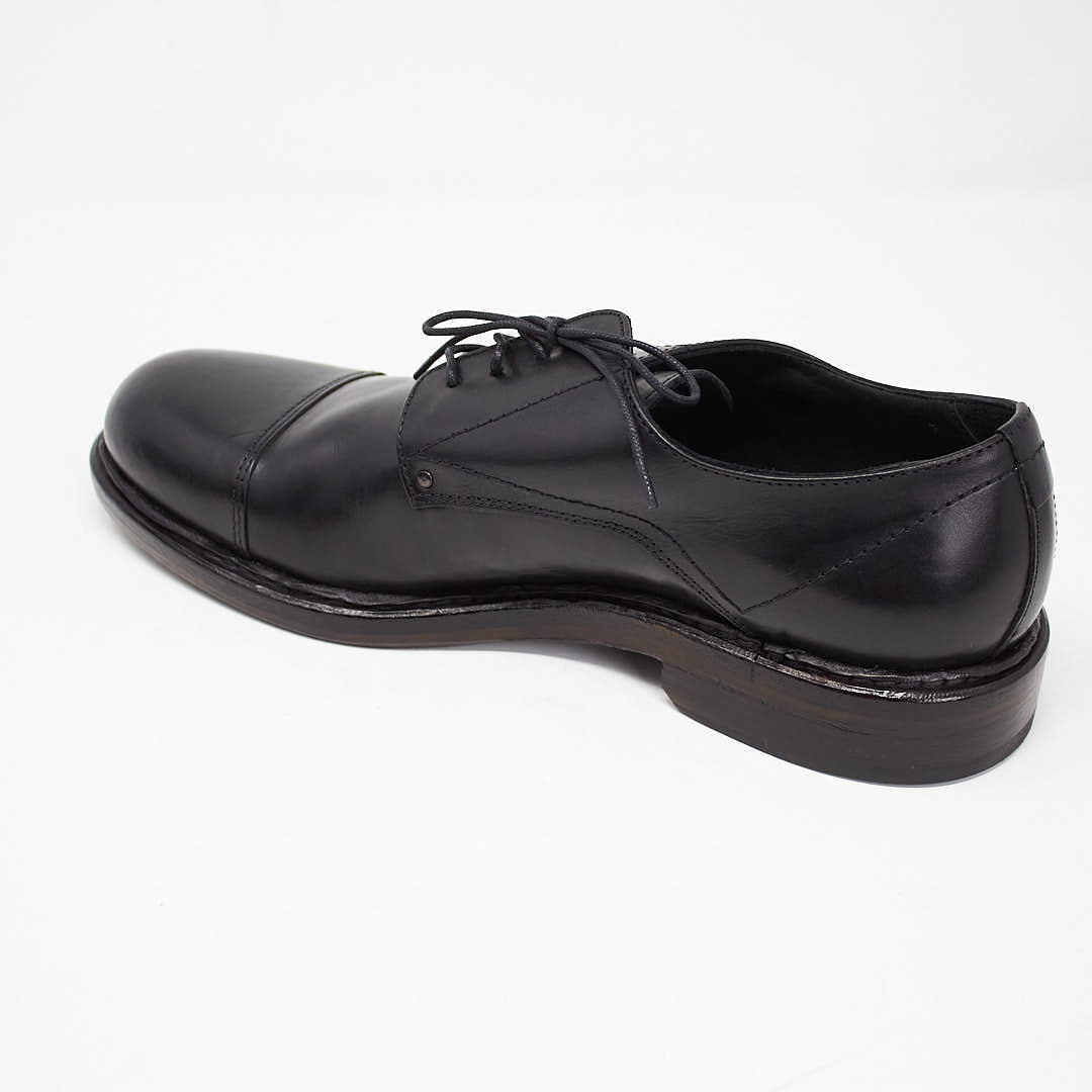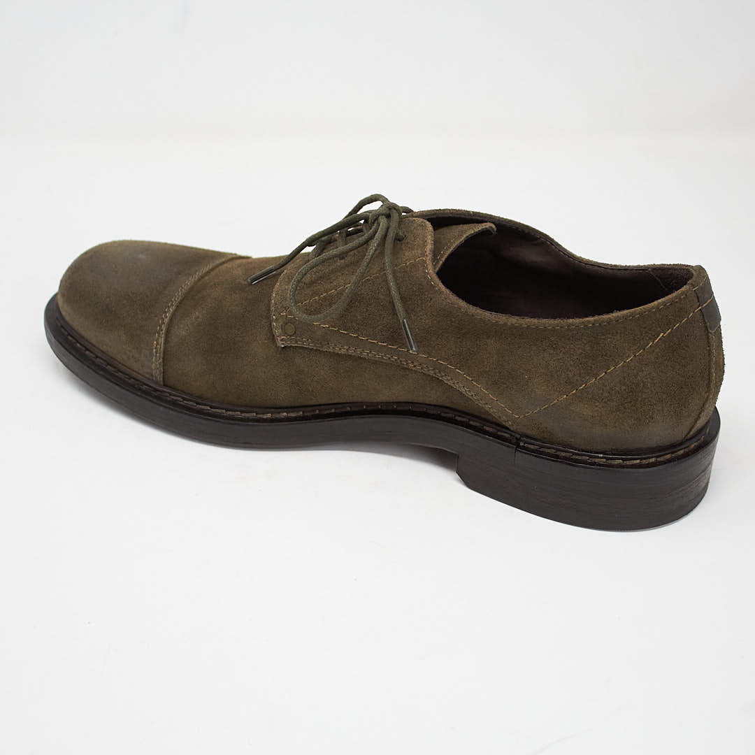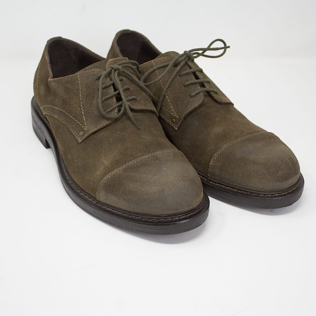 Derby with toe made in vintage effect suede and derby with toe in black calfskin.