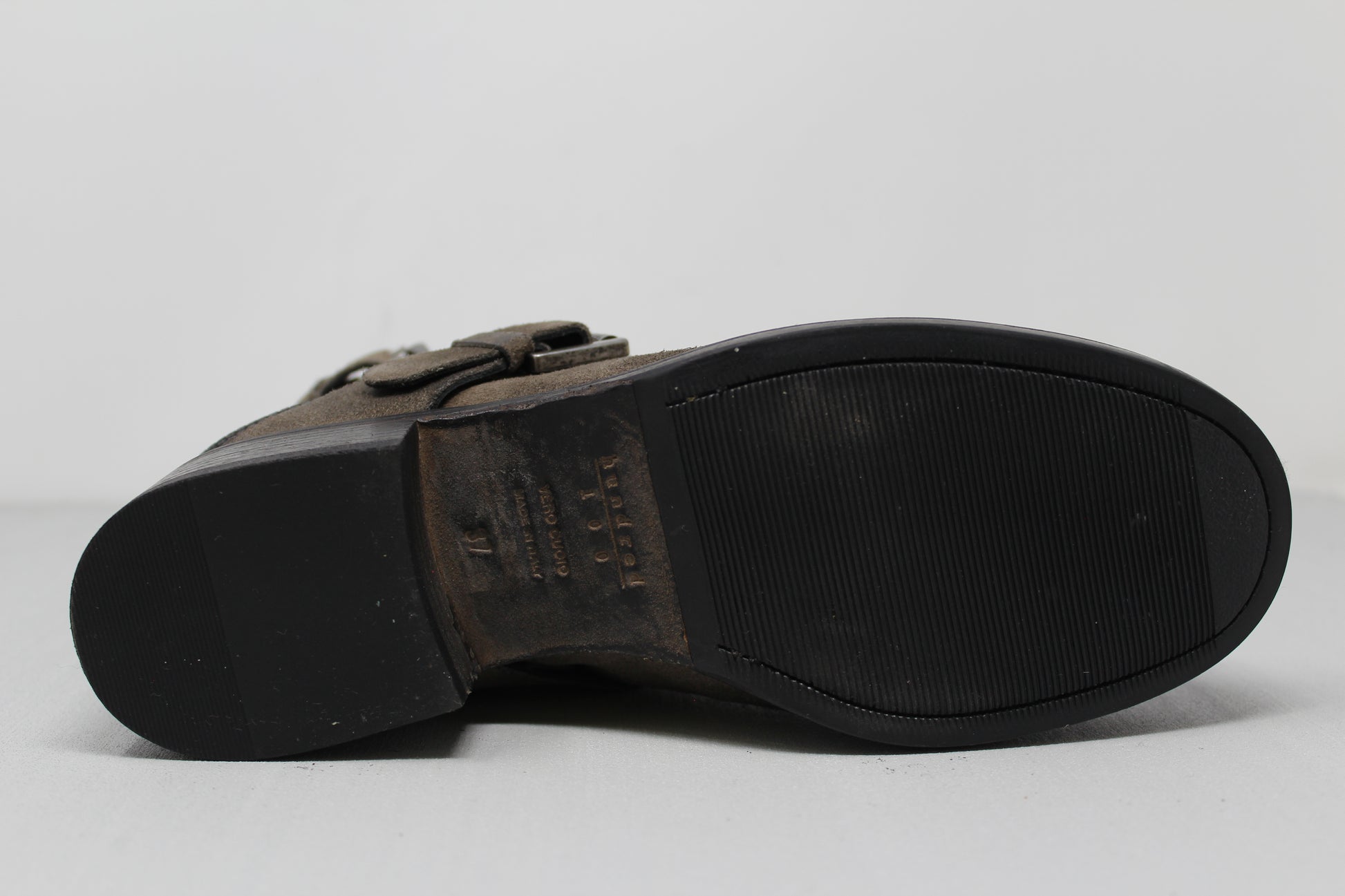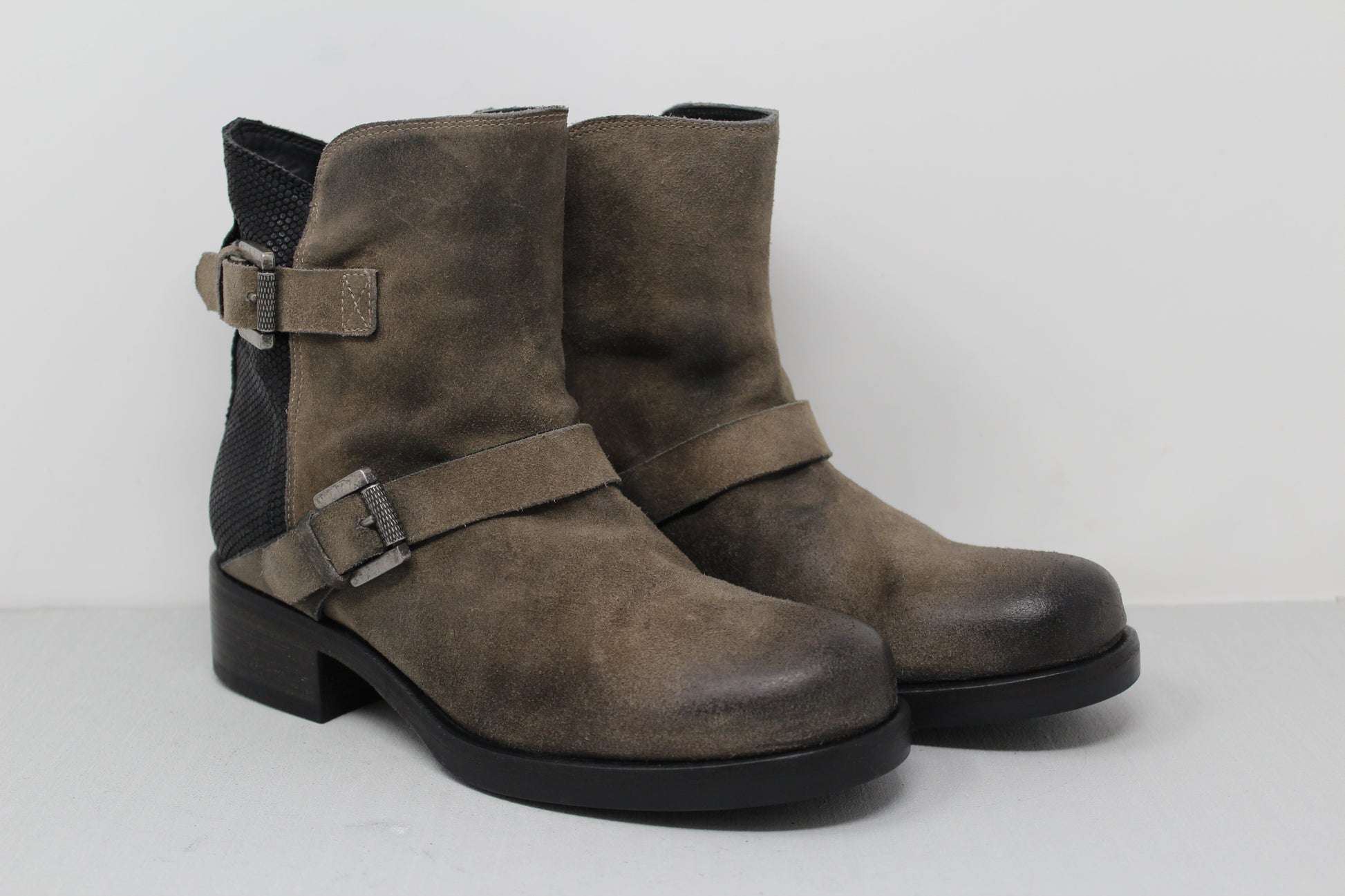 Women's double-buckle ankle boot made of suede and vegetable-tanned calfskin with a hexagonal print.