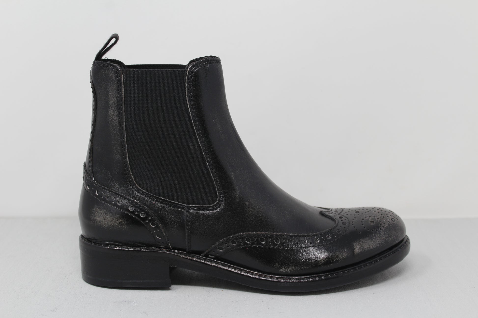 Women's Chelsea boot with double elastic and swallowtail motif made of calfskin with a bleached effect.