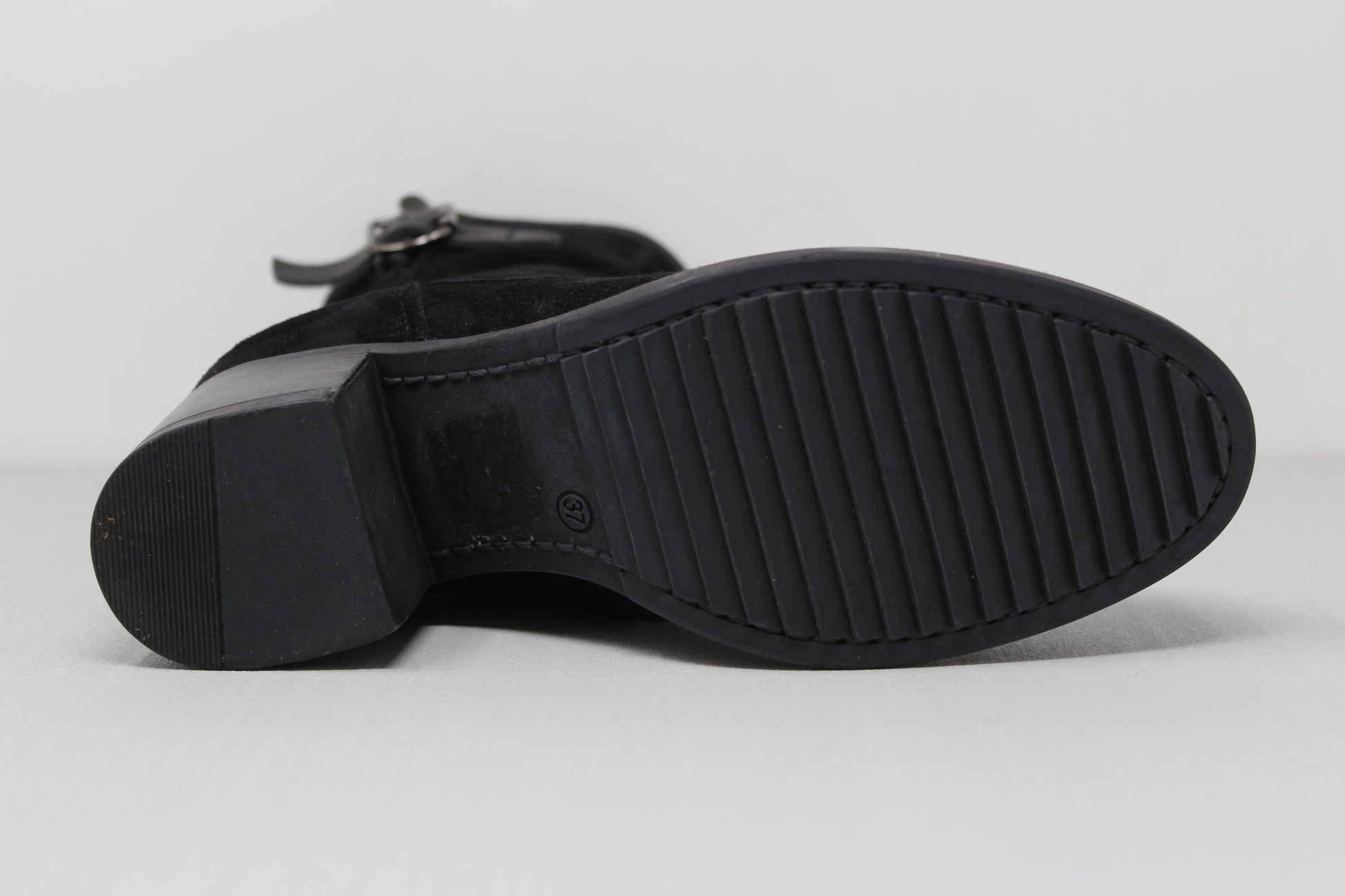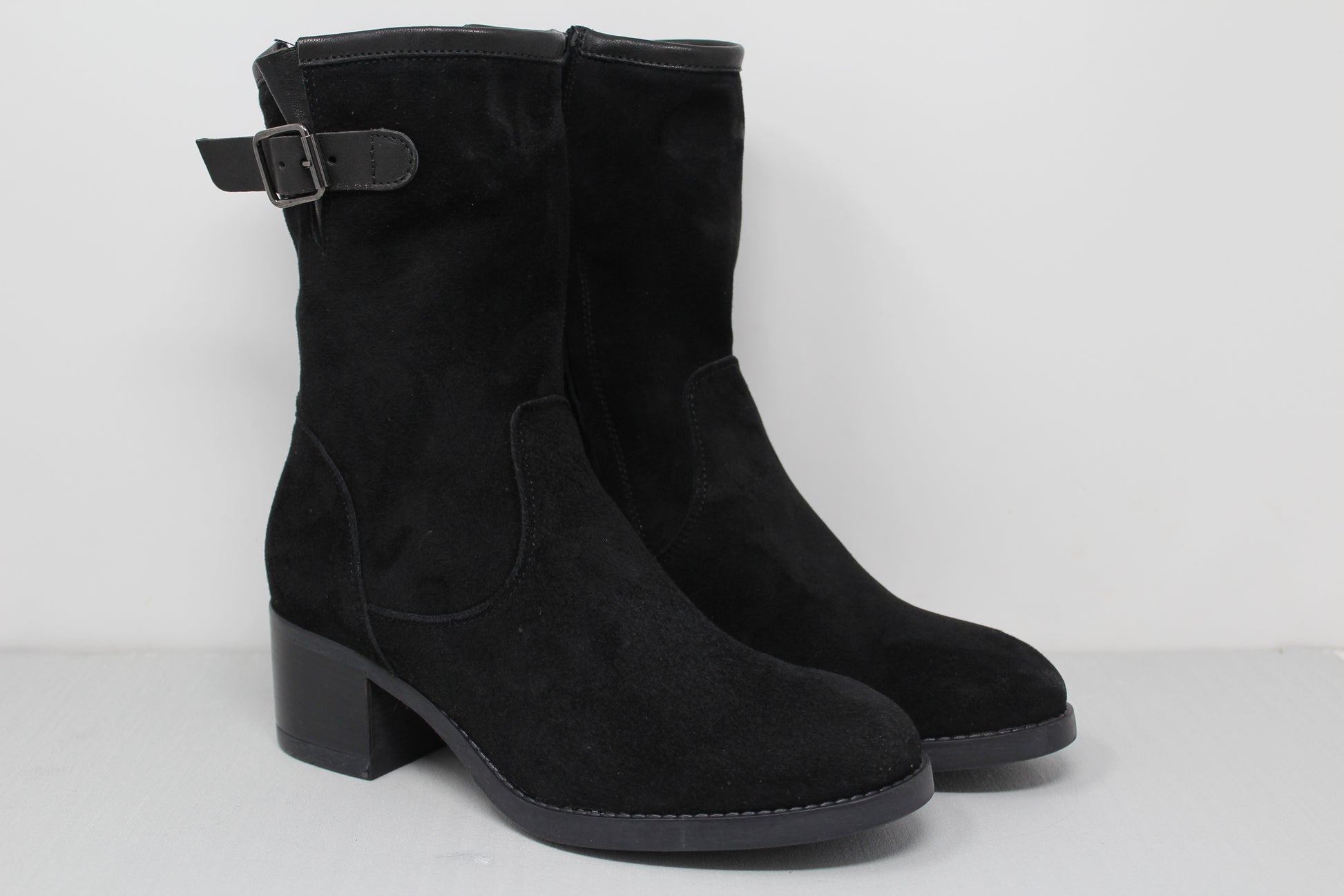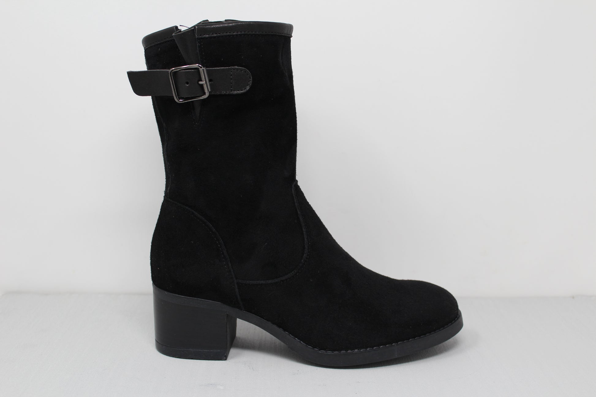 Women's ankle boot with internal zip and decorative buckle made of suede leather.