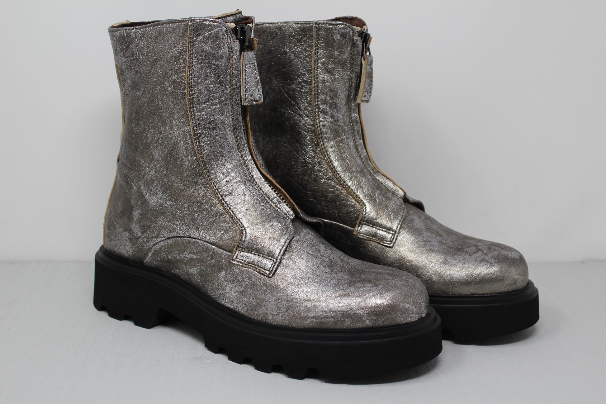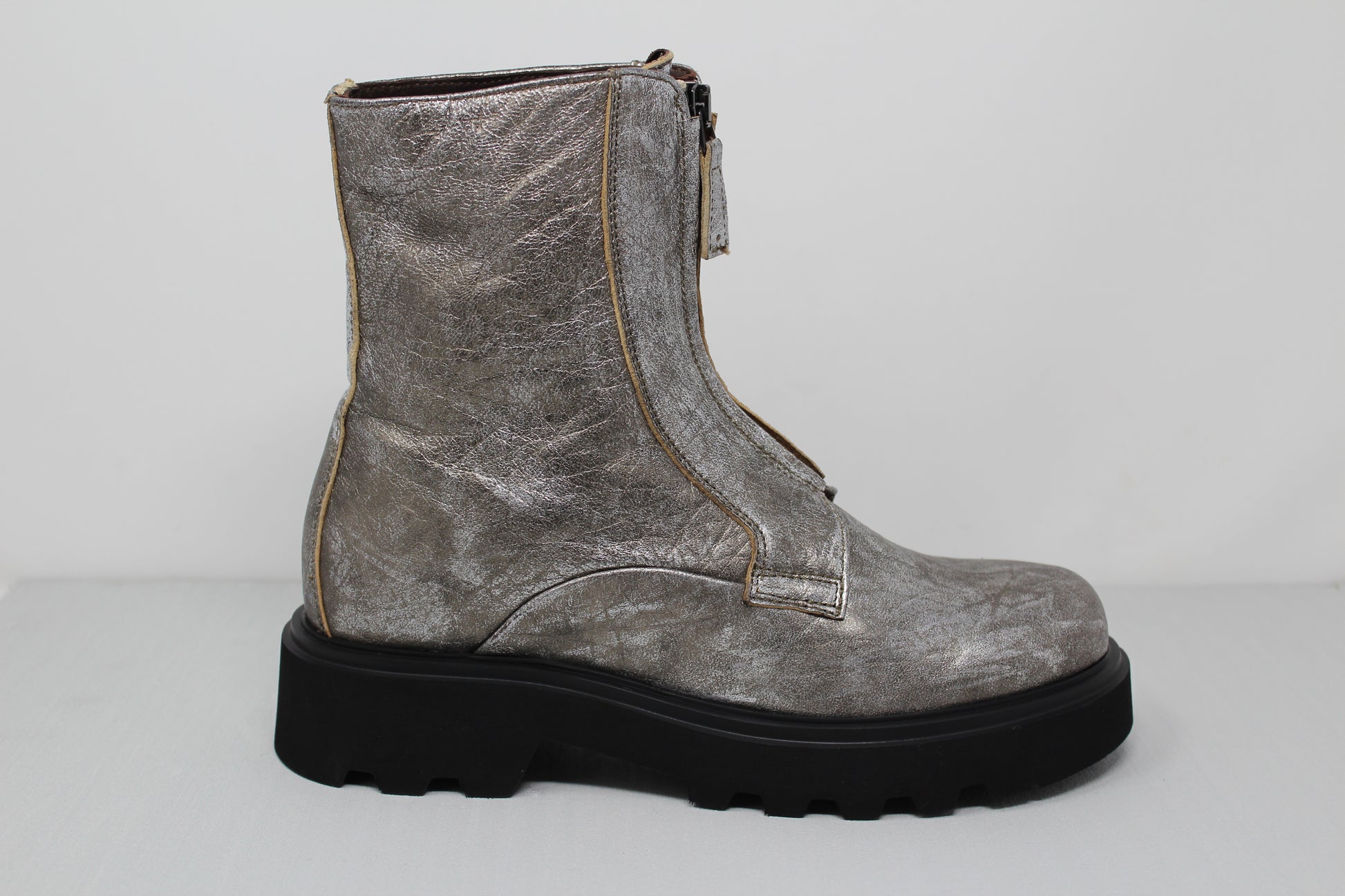 Women's ankle boot with front zip made of chrome-effect lambskin.
