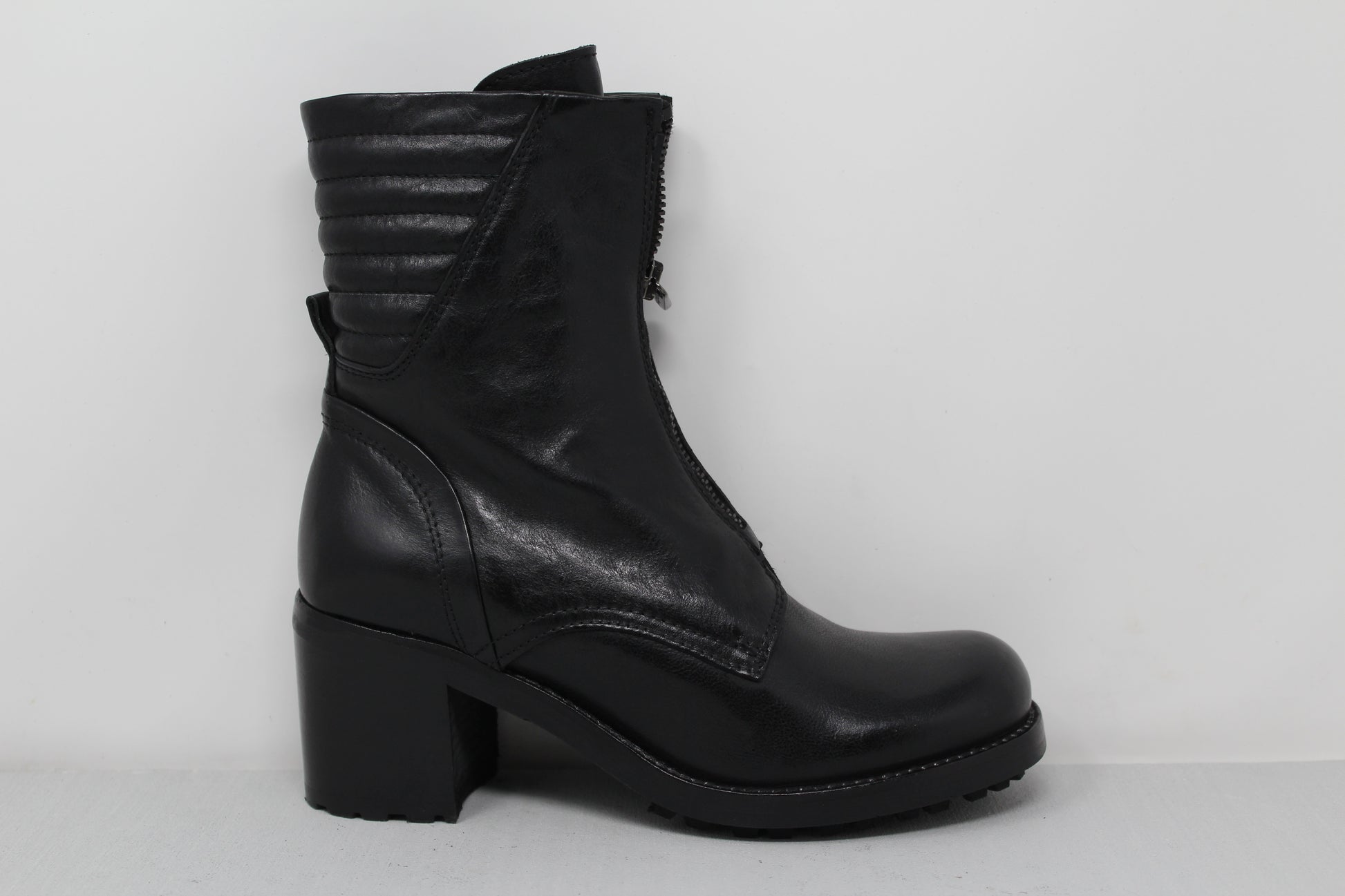 Women's ankle boot with front zip made of soft calfskin.