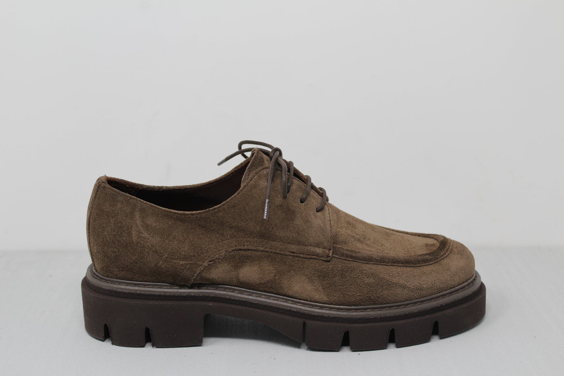 Scarpa derby da donna con vaschetta e allacciatura a 4 fori realizzata in pelle scamosciata.