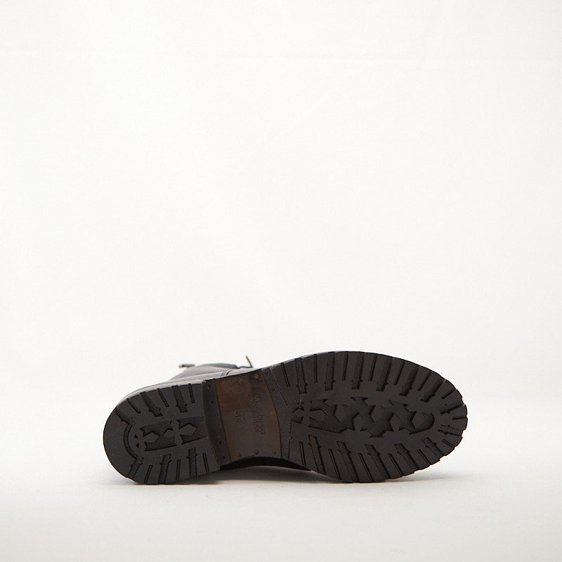 Il piede poggia su un soletto interno in gomma piuma di 2 mm ricoperto anch’esso di vera pelle per un comfort al top. Perfettamente abbinata ai tratti stilistici della calzatura è anche la suola “combat” che unisce grip e flessibilità.